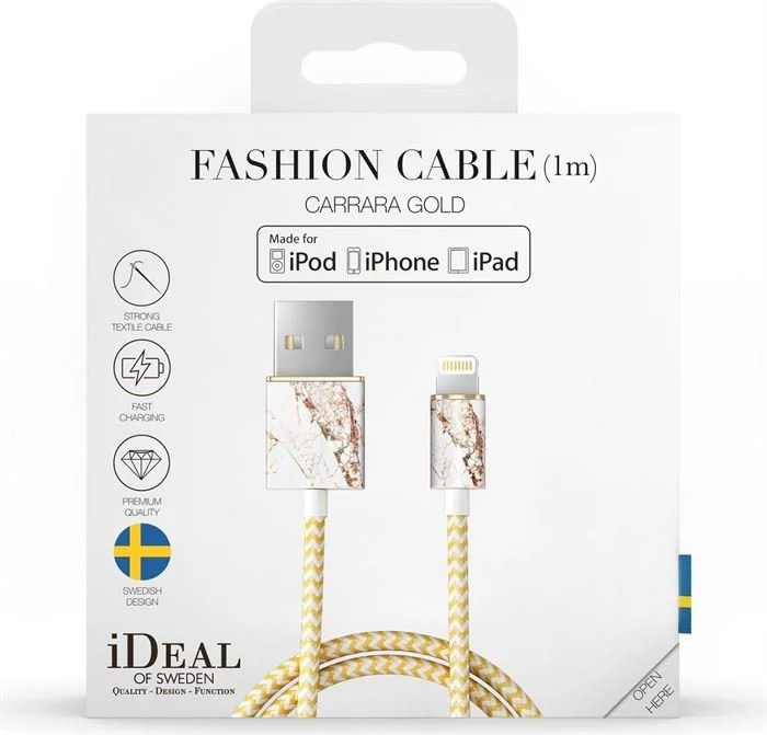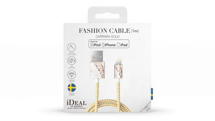 Carrara Gold Die hochstehende Marke iDeal of Sweden hat für Sie passend zur iDeal of Sweden Powerbank die schönen Lightning Lade- und Datenkabel herausgebracht. Machen Sie sich die Welt, wie Sie Ihnen gefällt Das Design dieses iDeal of Sweden Lightning Lade- und Datenkabels Carrara Gold macht Freude und beseitigt damit den Verdruss über den dauernden Kabelsalat, der beim Aufladen des Handys und anderer Geräte unweigerlich entsteht. Ein Gebrauchsgegenstand, der es zum Deko-Objekt schafft – warum sich nicht die Welt mit kleinen Details verschönern? Ligthning, Lightning Lade- und Datenkabel mit praktischer Länge Besonders mitgedacht haben die Verantwortlichen bei iDeal of Sweden bei der 1m Kabellänge.